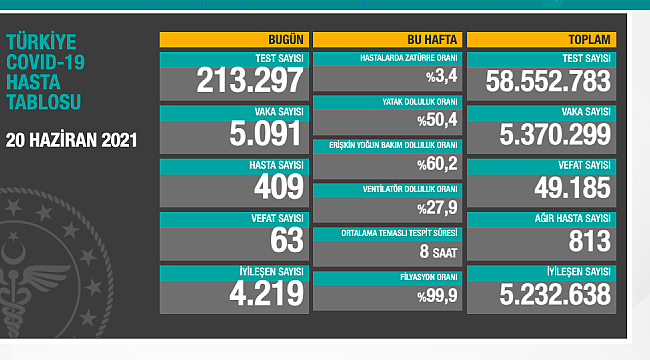 Türkiye'nin 20 Haziran 2021 günlük corona virüs tablosu açıklandı.