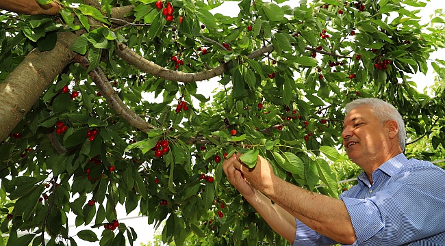 Mahalledeki bir bahçede kiraz toplayan Başkan Bilgin, 2020 yılı kiraz hasat sezonunun bereketli geçmesini diledi.